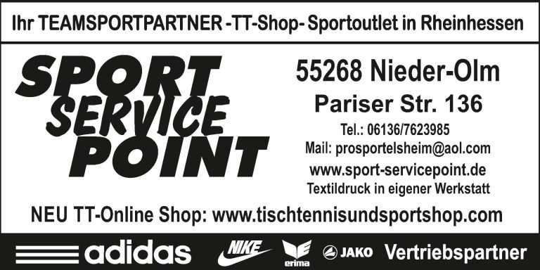 Wir freuen uns, seit 2024 vom Sport Service Point Nieder-Olm mit JAKO Trainings- und Mannschaftskleidung ausgestattet zu werden. Dank der kurzen Distanz zu unserem Ausrüster können wir nicht nur auf top Equipment zählen, sondern auch schnell und unkompliziert Dinge vor Ort klären.